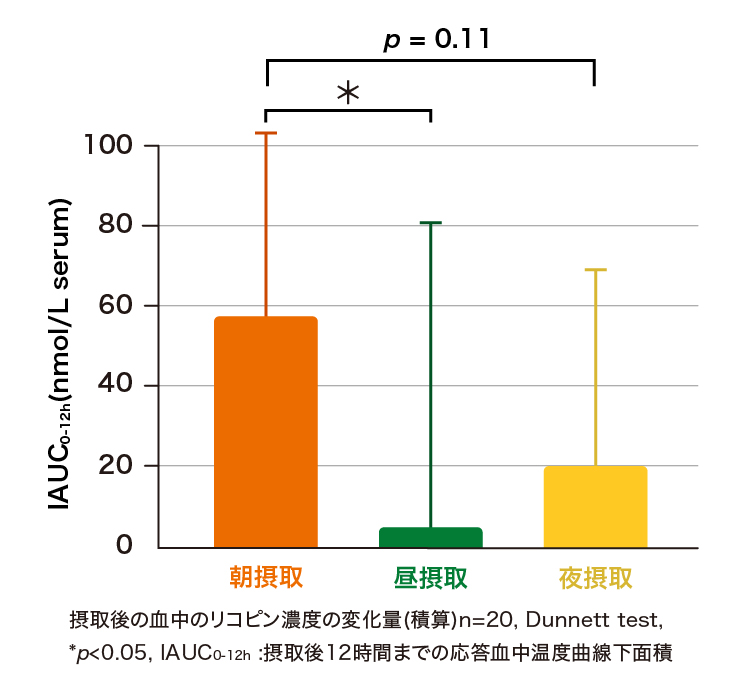 健康な成人男女にトマトジュースを朝・昼・夜の各時間帯で飲んでもらい、その後の血中リコピン濃度を計測し比較しました。その結果、朝に飲んだ場合に、最も体内に吸収されるリコピンの量が多くなるという結果が出ました。※3