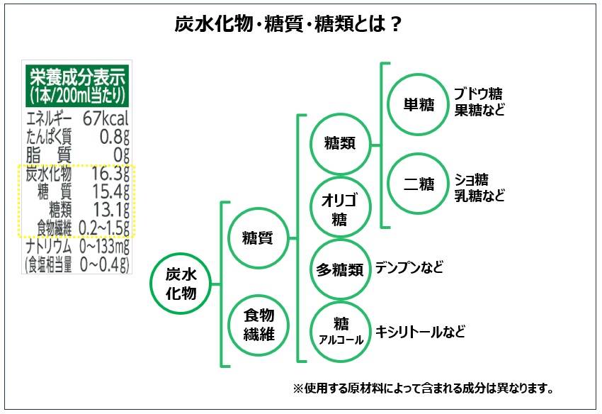 「糖類」は、糖質に含まれています。糖類は単糖類と二糖類の総称で、ブドウ糖、果糖、ショ糖等のことです。砂糖不使用や砂糖無添加等、 砂糖を使用していないことを商品に表示する場合は、商品に含まれている糖類の量を栄養成分表示に記載することが定められています。